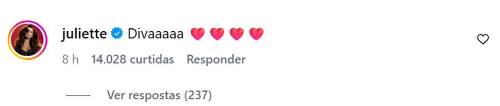 Neste terça (20) após a repercussão da dinâmica do ‘Sincerão’, Juliette comentou em uma publicação que citava a frase de Chaiany contra Sarah. “Divaaaaa” escreveu.